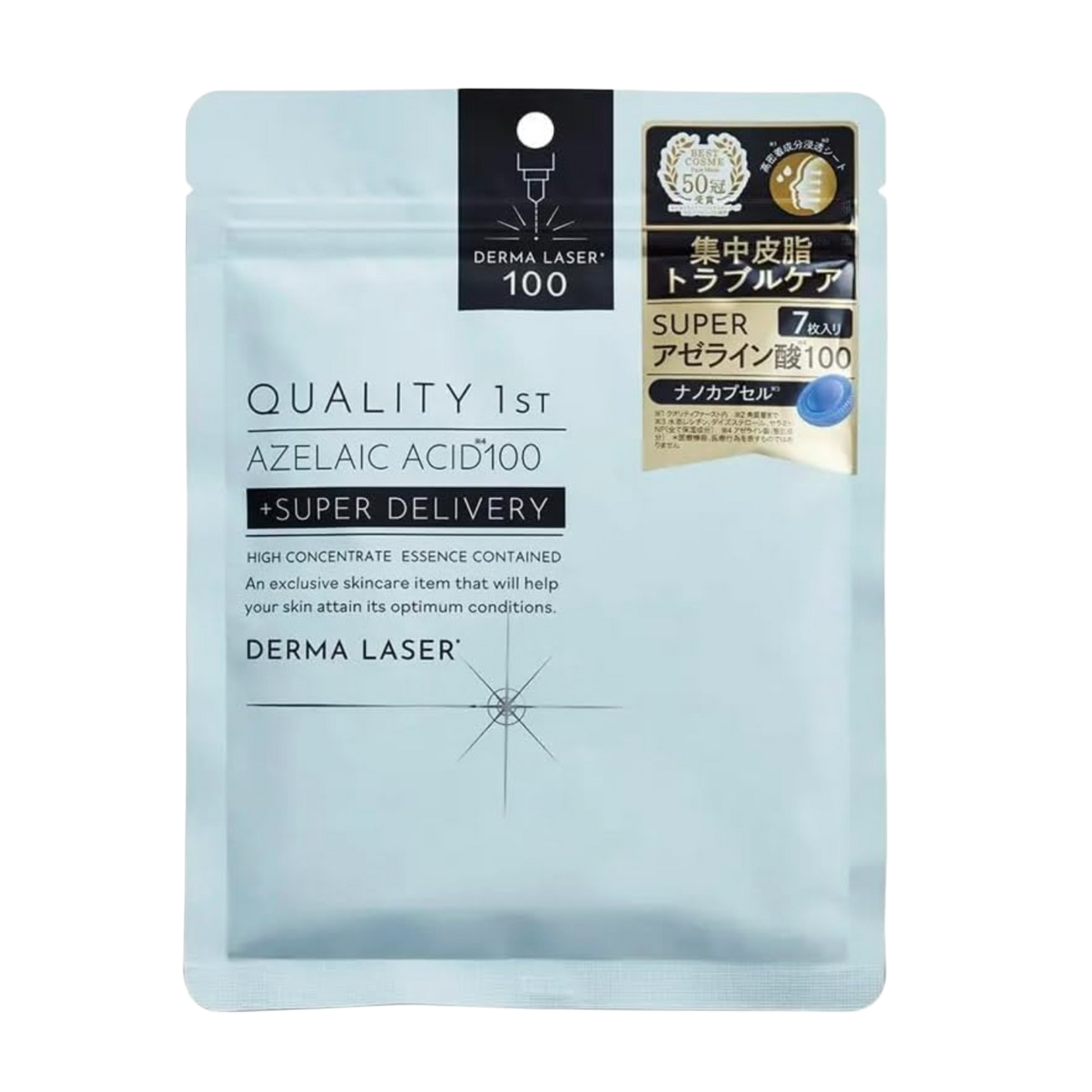 Derma Laser Super Azelaic Acid 100 (Quality 1st), 7 szt. to kojące i regulujące maski w płachcie z wysoką koncentracją kwasu azeleainowego (10%), niacynamidem, olejem z drzewa herbacianego i ceramidami NP, które zwalczają trądzik, redukują stany zapalne, regulują sebum, oczyszczają pory, wyrównują teksturę i koloryt skóry, idealne na tłustą, problematyczną cerę z grudkami i zaczerwienieniami.