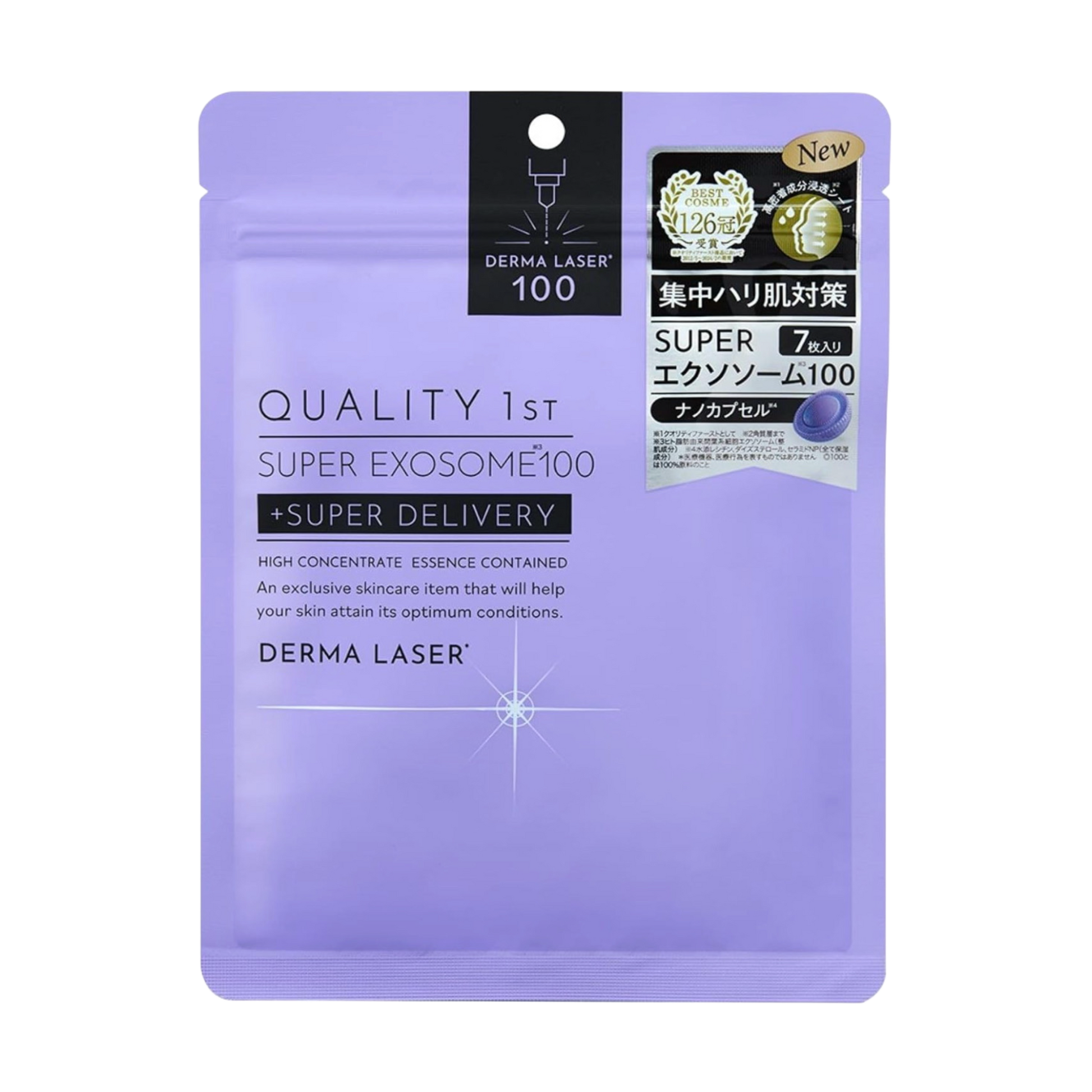 Derma Laser Super Exosome 100 (Quality 1st), 7 szt. to rewolucyjne maski w płachcie z wysoką koncentracją egzosomów z komórek macierzystych (ludzkie egzossomy z tkanki tłuszczowej), 5 formami witaminy C, niacynamidem i ceramidami NP, promujące ujędrnienie, anti-aging, poprawę elastyczności, blasku i regenerację skóry dzięki technologii nanocząsteczek penetrujących głęboko w naskórek.