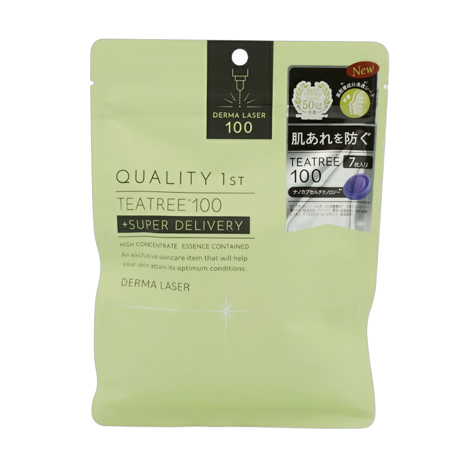 Derma Laser Tea Tree 100 (Quality 1st), 7 szt. to kojące maski w płachcie z wysoką koncentracją czystego ekstraktu i oleju z liści drzewa herbacianego (tea tree), wzbogacone ceramidami i glicyryzynianem dipotasowym, które łagodzą podrażnienia, zapobiegają szorstkości skóry, regulują sebum, działają antybakteryjnie i przeciwzapalnie, idealne po opalaniu, noszeniu masek czy na cerę trądzikową.