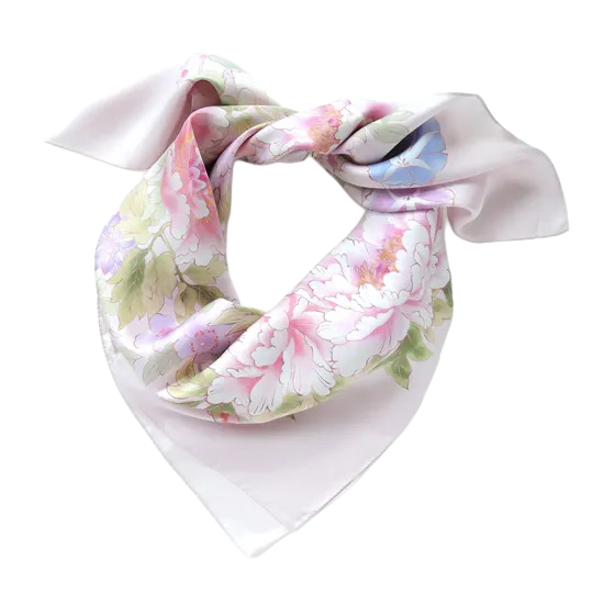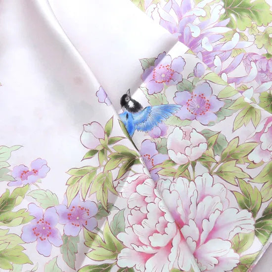 To jedwabna tkanina typu twill wykonana w 100% z jedwabiu, ręcznie barwiona w Kioto z motywem kolorowych kwiatów i ptaków w delikatnym, jasnoróżowym odcieniu, jaśniejszym niż w wersji mini.