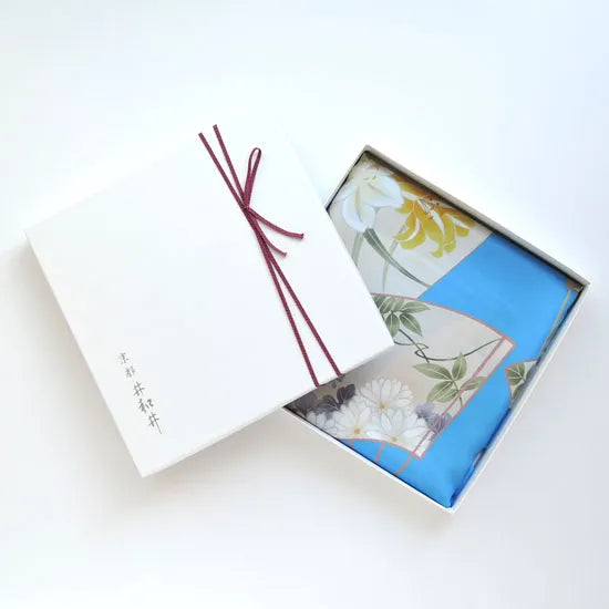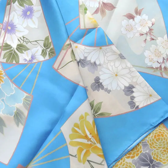 To jedwabna tkanina typu twill w 100% wykonana z jedwabiu, ozdobiona motywem wachlarza, którą ręcznie zabarwiono w Kioto.