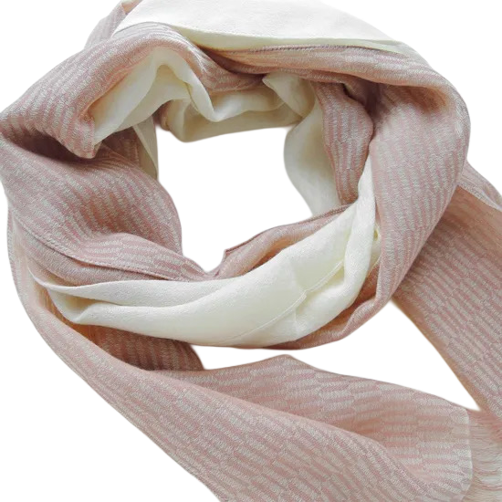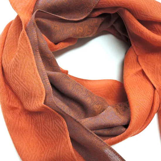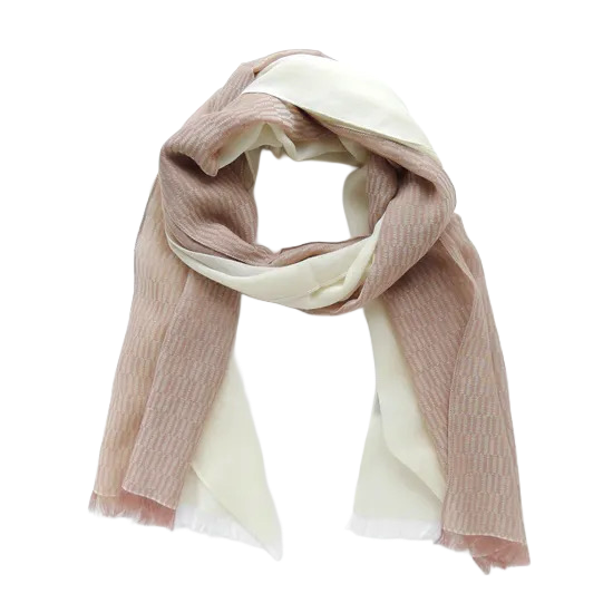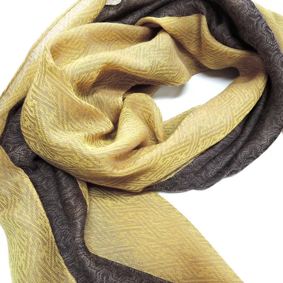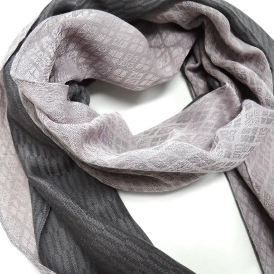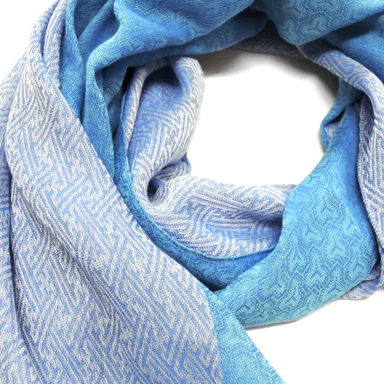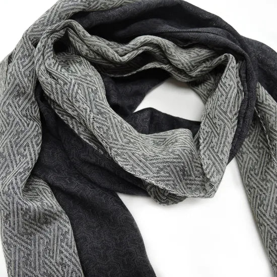 Szal łączy dwa różne wzory, a zmieniając sposób składania, można uzyskać trzy różne warianty prezentacji wzoru.