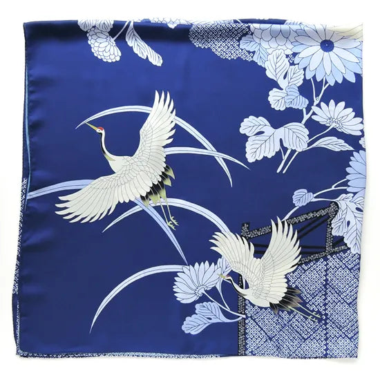 Wzór przedstawia majestatyczne, liczne żurawie wzbijające się w powietrze oraz duże kwiaty chryzantemy.