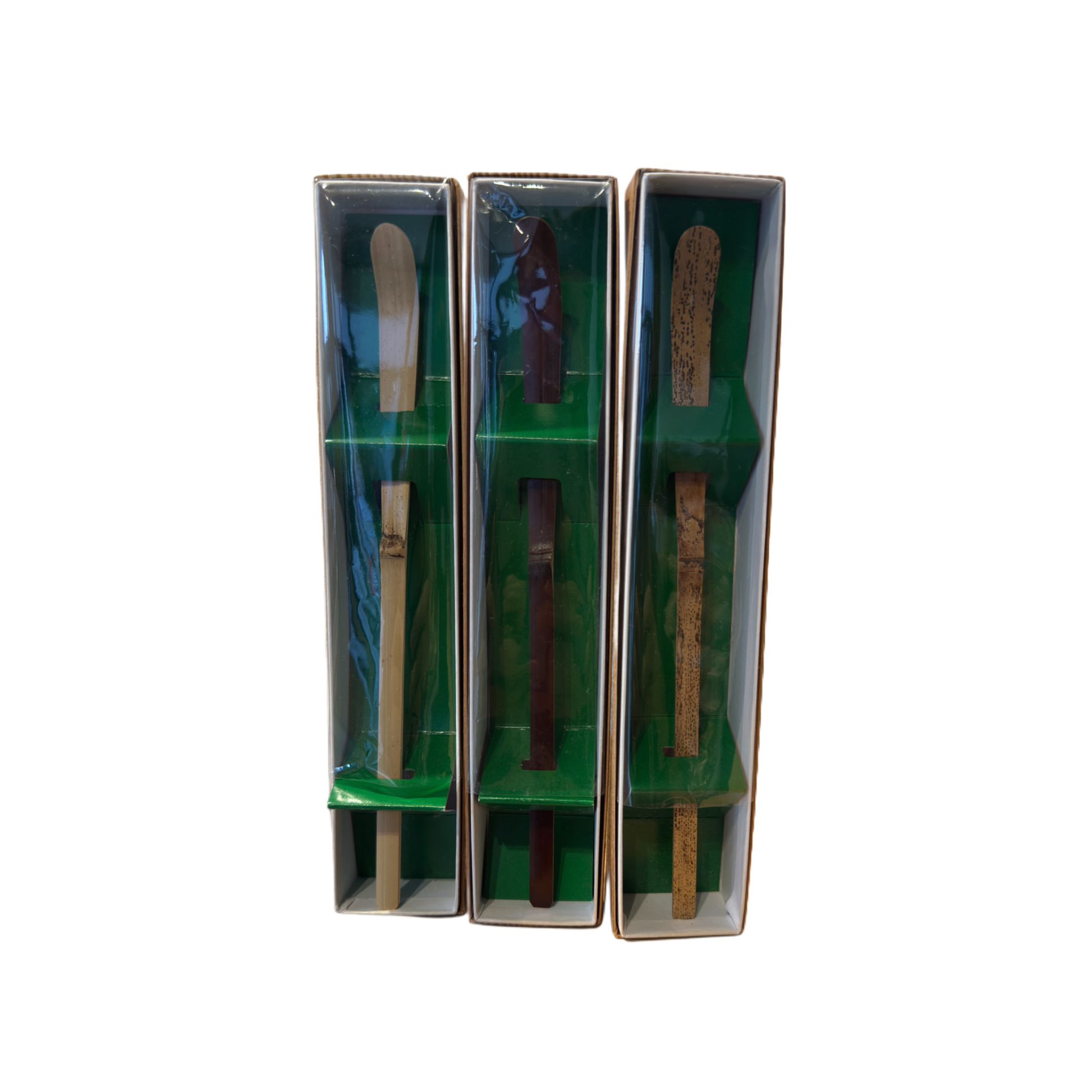 • Prawa: Naturalny szarobrązowy kolor z widocznymi słojami pochodzi z dojrzałego, niebarwionego bambusa, który był poddany lekkiej obróbce, ale zachował swój oryginalny wygląd. Tego typu chashaku mogą być określane jako “Madake” (真竹), czyli typowy bambus używany w ceramice i utensyliach.