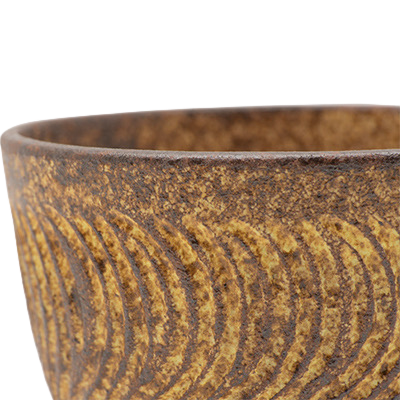 Miseczka została wykonana z nieglazurowanej gliny, wykorzystując naturalny „smak ziemi” w surowym materiale, udekorowanego odważnym wzorem そぎ文様 (sogi mon’yō). Wykończenie to nadaje powierzchni szlachetność i teksturę przypominającą 縄文土器(Jōmon doki) — pradawne japońskie naczynia ceramiczne z epoki Jōmon.