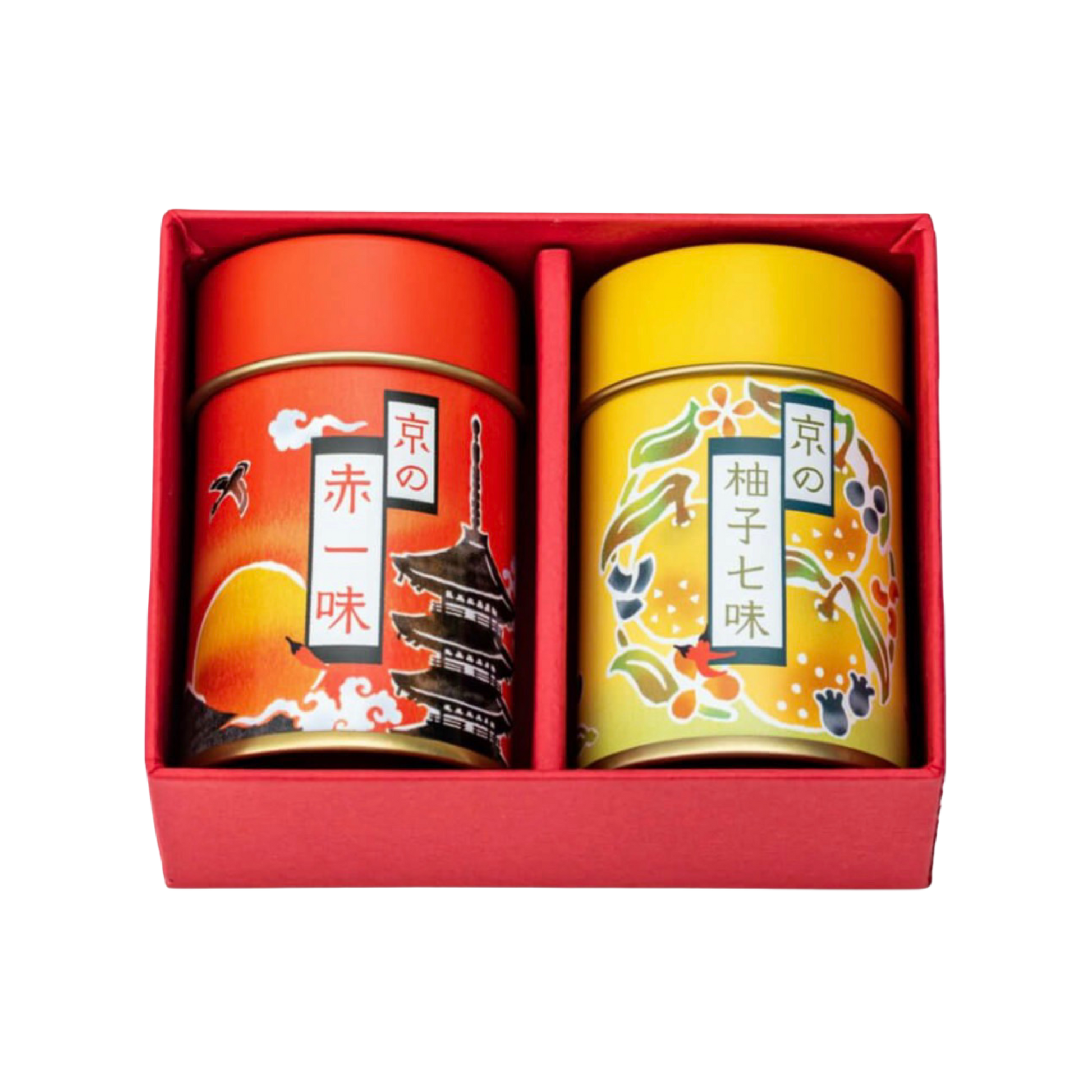 W zestawie znajdują się dwie puszki – „czerwone ichimi” i „yuzu shichimi” – zapakowane w eleganckie, czerwone pudełko upominkowe. Doskonale nadaje się na drobny prezent lub pamiątkę z Kioto.